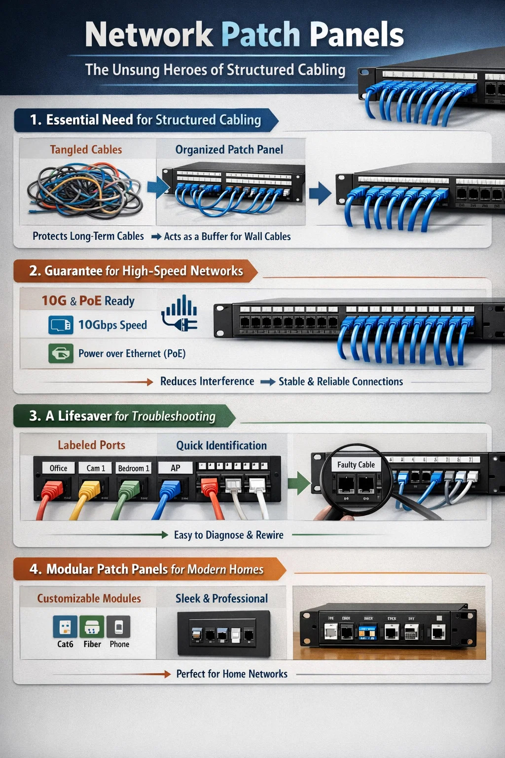 Ochrona warstwy fizycznej: Kable sieciowe wewnątrz ścian są zwykle sztywne. Jeśli są podłączone bezpośrednio do przełącznika, częste podłączanie i odłączanie oraz ruch mogą spowodować uszkodzenie żył przewodów. Panel krosowy działa jak bufor; pozostaje nieruchomy, a krótkie kable krosowe przesuwasz tylko na zewnątrz, chroniąc drogie, długie kable wewnątrz ściany.