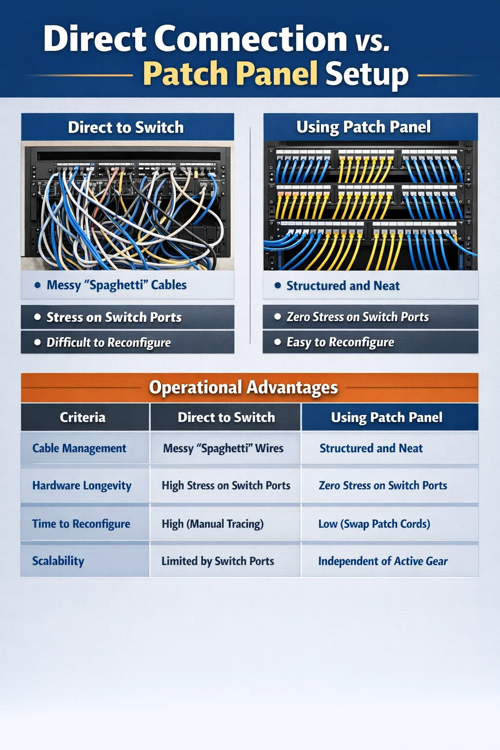 | Kryteria | Bezpośrednio do przełącznika | Korzystanie z panelu krosowego |